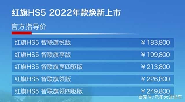 车家号·0浏览·2024-07-20 01:55 · 陕西9月28日,新款 红旗HS5(参数|询价)上市,新车共推5款车型,售价18.38-24.98万。作为年度改款车型,新车主要对外观内饰进行了调整并加入最新网联3.0版本的车机系统。