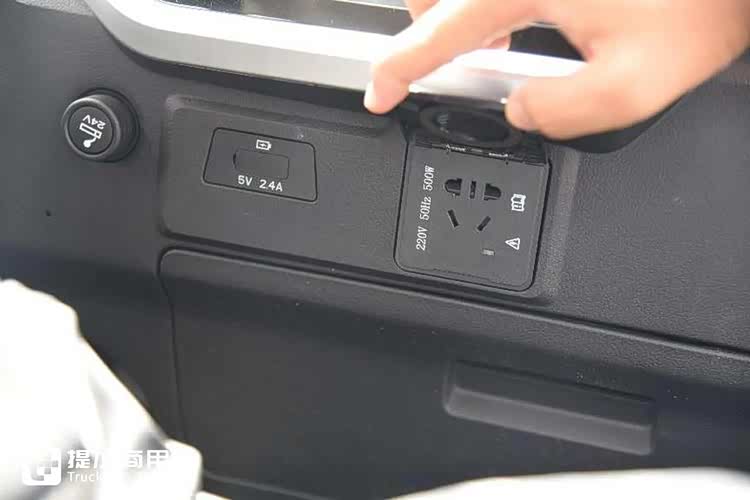除此之外,这辆帅铃S9也从很多细节上体现出设计的用心以及对驾乘人员的舒适性和便利性的追求。车内搭载了包括220V、500W通用电源插座及USB充电接口,这种贴心的设计能够最大限度的满足驾乘人的用电需求。
