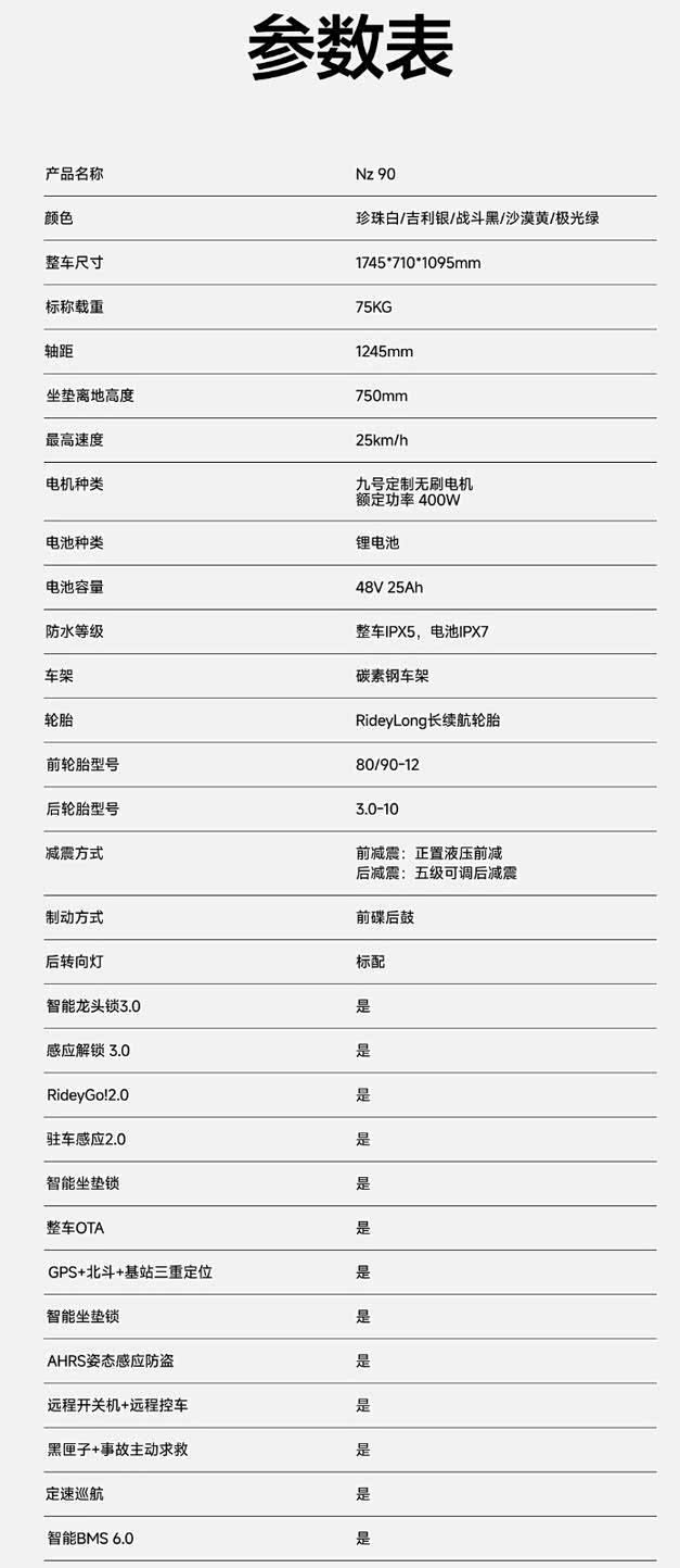 Nz 90 首发价格为 4599 元,搭载 48V 25Ah 锂电池,标称续航 80km,实际续航至少在 60km 以上是没有问题的。这次 Nz 90 升级到了五级可调的后减震系统,无论你身高多高,都可以找到最佳的减震效果。此外 Nz 90 搭载了 400W 的无刷电机,前碟后刹系统,让刹车更加安全放心。如果你对外观有要求的话,Nz 90 提供了 5 款不同的配色供你选择,而且不管是什么颜色搭配都非常耐看,因为 Nz 90 采用了碳素钢车架。