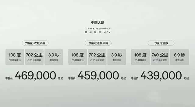 2024款极氪ZEEKR 009七座过道版 两驱 108kWh、七座过道版 四驱 108kWh、六座行政版 四驱 108kWh上市,售价43.9-46.9万元。(三款新车高配配置保持一致,主要区别在于座椅布局及驱动形式)