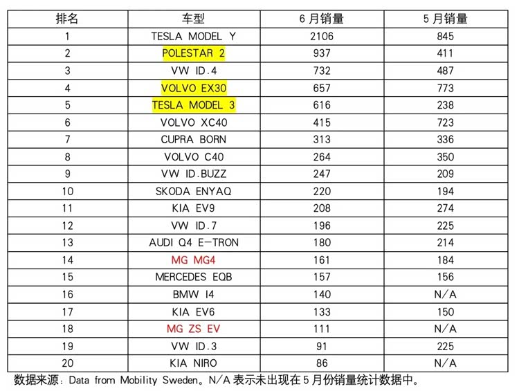 6月份,特斯拉Model Y以2106辆注册量成为瑞典最畅销的电动车。紧随其后的是Polestar 2,以937辆的成绩位居第二。大众ID.4可谓是以黑马的姿态,力压沃尔沃系的电动车,排名第三。沃尔沃EX30虽然只名列第四,但是其终端交付也达到了657辆,和过往月均700辆基本保持一致。