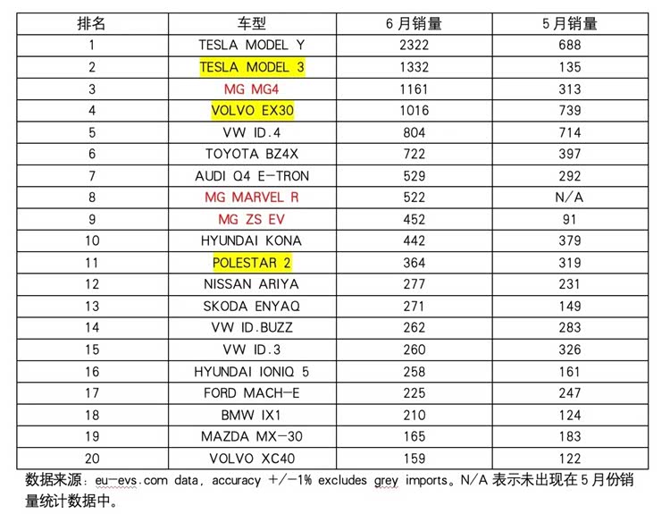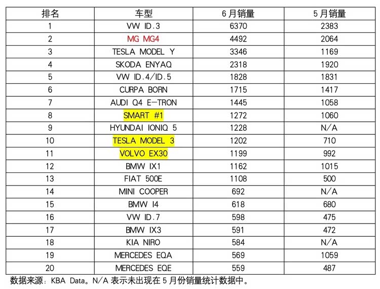 本月在销量占比排行榜上进步最快的当属大众品牌,通常排在10位以下的大众在6月份跃居第四。旗下销量最好的当数ID.4和ID.3两款车型,它们的注册量都是820辆。此外,包括现代Kona、沃尔沃EX30和MG4在上个月表现都不差。