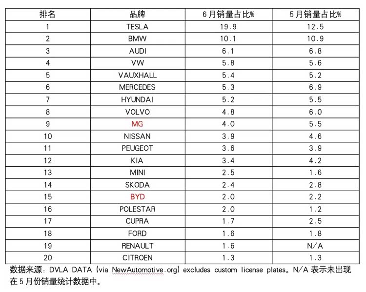 从销量排名来看,6月份特斯拉以19.9%的市场份额,重新领跑英国纯电动汽车市场。其中,Model Y和Model 3分别贡献了3642辆和3111辆,在排行榜上平分秋色。尤其值得一提的是,这两款车型也都挤进了英国整个车型销量排行榜前十名。在英国汽车市场上,特斯拉还是有比较高的号召力。紧随其后的则是宝马和奥迪,两者的市场份额分别为10.1%和6.1%。