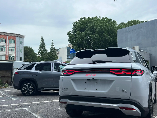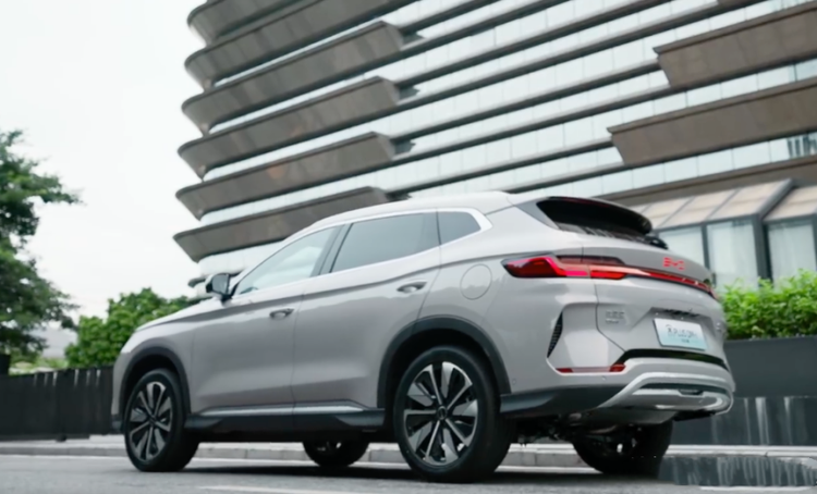 车尾看起来非常饱满,采用贯穿式尾灯,底部还配有黑色和银色相间的后包围,有一种很强的厚重感。在尾灯下面还有可以发光的“BYD”标识,进一步提升了辨识度。