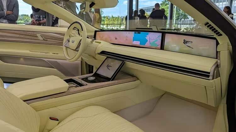 控台上装有一个55英寸的巨型显示屏。然而,正是木制的装饰元素成为了这款概念汽车的真正特色。凯迪拉克公司透露,他们的手工艺者利用五种独特的木制表面,进行手动裁剪,并确保每一样都单独安装到适当的位置。车辆的门面板呈现出一种高贵的风采,主要是因为其上镶嵌了一种金属装饰的精致木饰板。