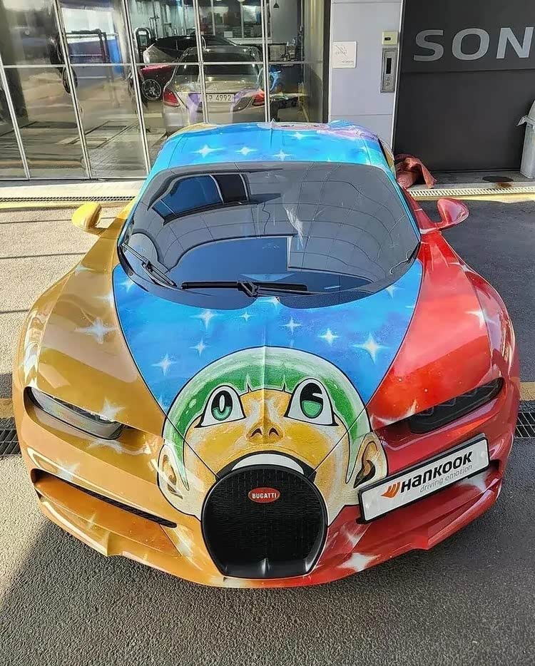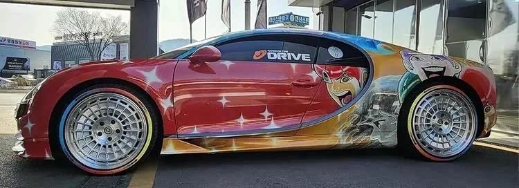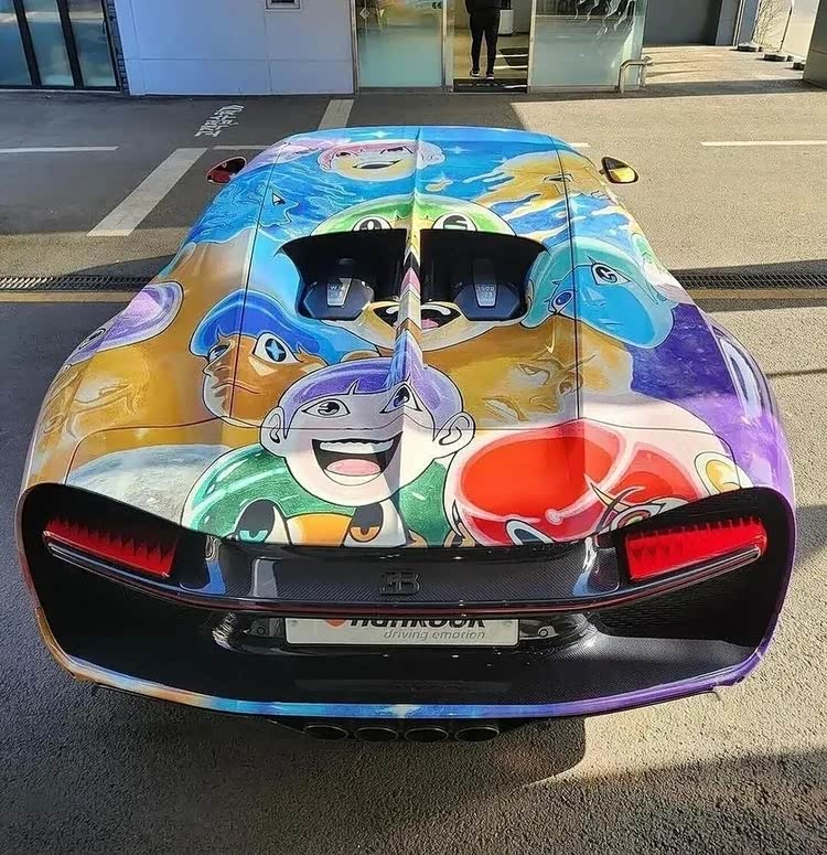 不过下面这台布加迪Chiron的涂装就涉及我的知识盲区了,看画风应该是美漫之类的,有知道这是哪个人物或者动漫的朋友欢迎来科普一下。普通的布加迪Chiron回头率就已经很高了,更何况是这种贴了涂装的,简直就是路上的显眼包。