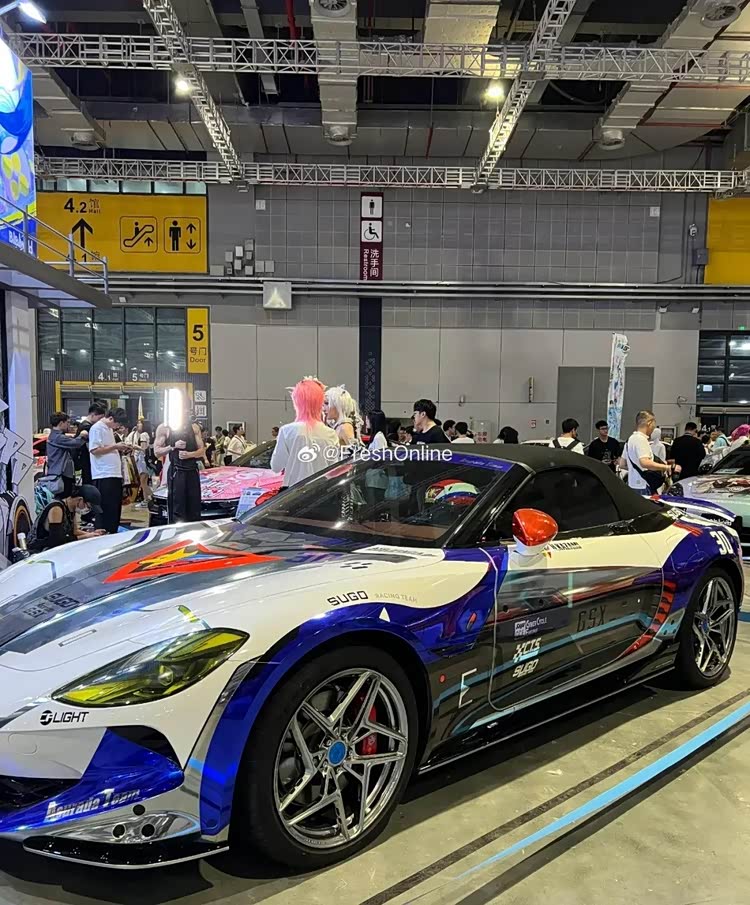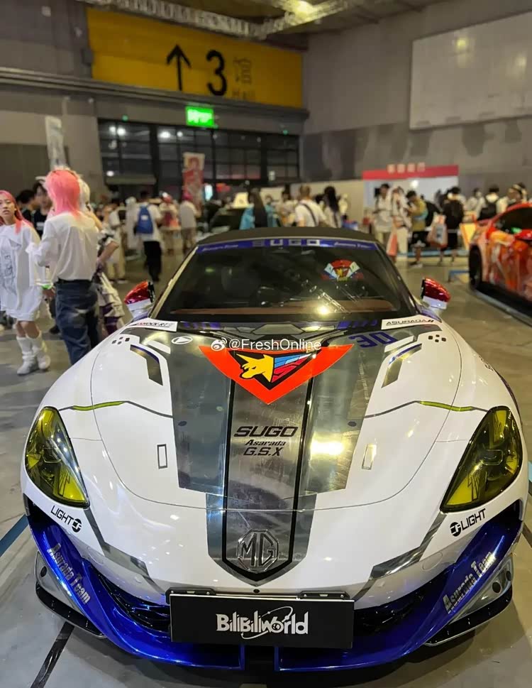 下面这台名爵Cyberster的涂装就比较贴合汽车的主题了,超智能方程式的阿斯拉达涂装。同时我们能看到这台车的刹车和轮毂都改了,整体呈现出来的效果确实要帅很多,而且这种类似机甲风格的涂装也很适合Cyberster这款车。