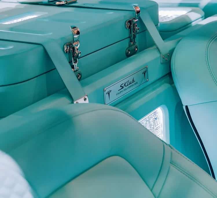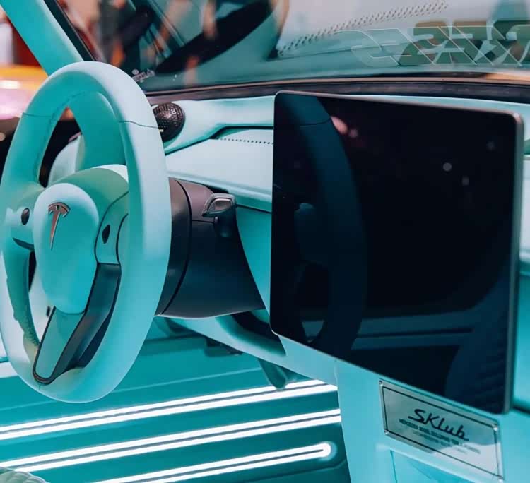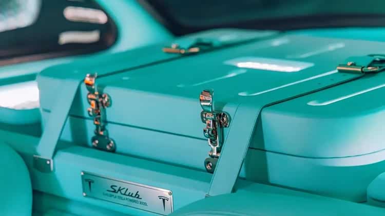 内饰方面除了方向盘和中控还是保留着Model 3的设计外,其他地方都进行了重造,整体配色采用Tiffany蓝,和外观的配色还是蛮搭的,其余细节则是根据车主的想法,很有美丽国的老钱风。