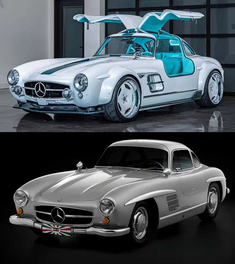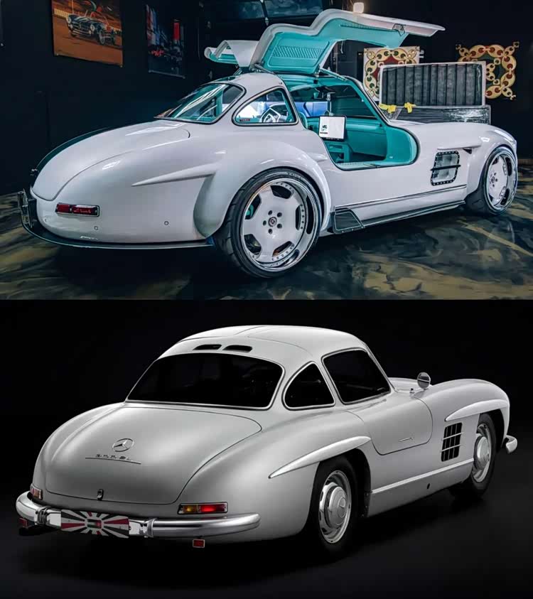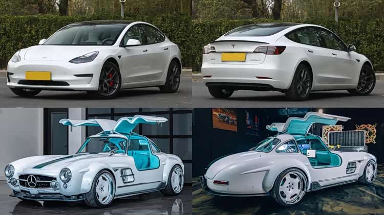 最后我们拿这台特斯拉改装车跟原厂奔驰300 SL做对比,大家觉得这台车改得像吗?