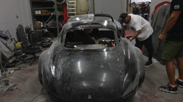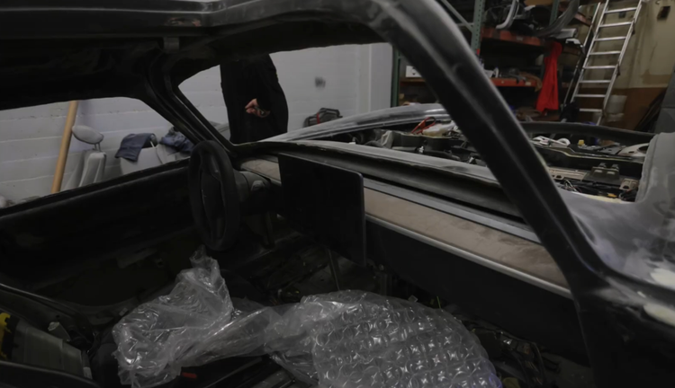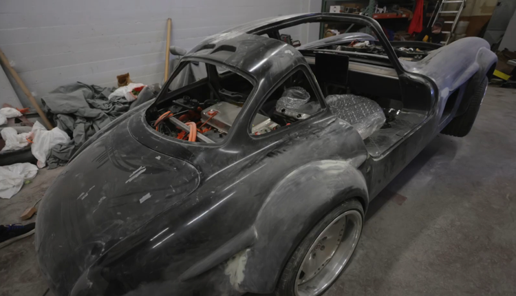 接着就是将奔驰300SL的外壳套在这台Model 3上 ,可以看到这时候后排已经全部舍弃了,取而代之的则是电池,至于前半部分则是大家非常熟悉的特斯拉 Model 3的内装,然后就是一系列的细化和其他零部件的安装工作。