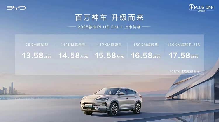 北京时间7月25日,笔者从比亚迪汽车官方获悉,2025款比亚迪宋PLUS DM-i现已正式上市,共推出5款车型,指导价格区间为13.58万-17.58万元。据悉,2025款比亚迪宋PLUS DM-i是首款应用第五代DM技术的SUV,主要针对功能配置以及动力等做出优化升级,购车门槛相比宋PLUS DM-i荣耀版有小幅提升。作为参考,比亚迪宋PLUS DM-i荣耀版的指导价为12.98万-16.98万元。