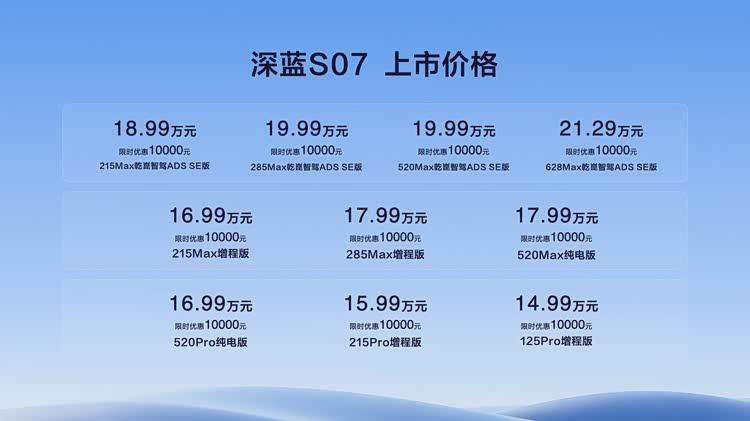 7月25日,科技新主流SUV——深蓝S07正式上市,新车推出增程版以及纯电版两种动力,其中增程版售价区间为14.99万元-19.99万元,共有6款车型;纯电版官方指导价格为16.99万元-21.29万元,共有4款车型。在上市的同时,深蓝S07还带来了全系限时优惠1万元,“七大智感大礼”和限时赠送的华为乾崑智驾ADS SE版智感进阶礼等丰富的购车权益。