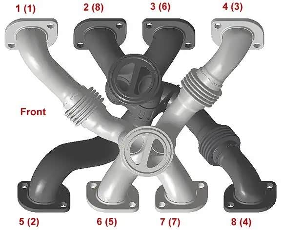 当然短板也有,由于十字曲轴的每排气缸都有两个活塞在90°间隔达到上止点,所以会存在严重的排气干涉(可以理解为排气堵车了),所以需要在排气中段增加H型或X型平衡管,用来增加低转速的扫气能力(像雅马哈R1那种十字曲轴四缸机也是)。