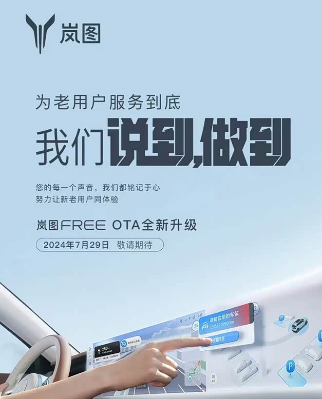 今日,岚图汽车宣布, 岚图FREE(参数|询价)将迎来一次重要的OTA升级。这次升级主要针对2024款岚图FREE,将为老车主带来17项功能的新增和优化。这次升级的主要亮点包括0层级交互界面、人性化智能语音和车道级导航三大方面,升级后的OS 6.0系统将为用户带来更极致的智能出行体验。