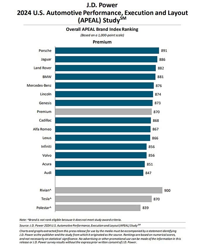 J.D.Power 表示,一般品牌的满意度分数有 1 分的上升 ( 838 ) ,但依旧不敌豪华品牌的评价 ( 870 ) ,双方在 2021 年时的差距最小,那时仅有 19 分的距离。看到车厂排行部分,Porsche 曾在 2021 年和 2022 年夺得豪华品牌的冠军,不过在 2023 年则败给了捷豹,而来到 2024 年 Porsche 获得 891 分的评价,击败捷豹的 886 分重回冠军席次,至于路虎以 882 分排在第 3 名,第 4 和 5 名分别是宝马与奔驰,而 2024 年度评价最高的车款则由宝马 7系 所夺得。
