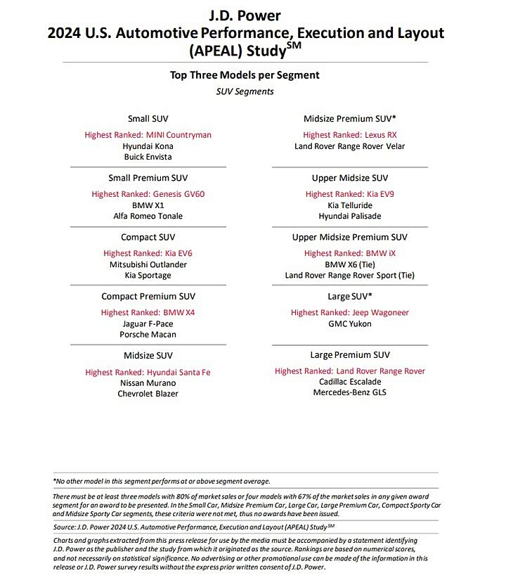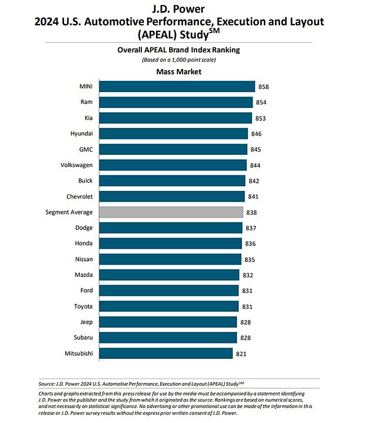 至于一般品牌部分 MINI 以 858 的分数夺得第 1,去年的冠军 Ram 则落居第 2,起亚排名则从第 5 爬升至第 3,然而 现代集团可说是今年度最大赢家之一,在各个级别中共计有 7 款车型获奖,包括 Genesis GV60、现代Santa Fe、起亚嘉华、起亚EV6、起亚EV9、起亚Forte 和起亚K5。