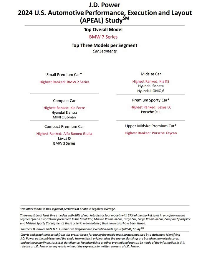 美国 J.D.Power 近期公布 2024 APEAL 新车魅力调查,J.D.Power 指出,车辆的信息娱乐系统满意度评分依旧未很理想,不过总评分 847 ( 满分 1,000 ) 较去年增加了 2 分,同时非特斯拉阵营的电动车分数更是创下 877 分新高,并且超越特斯拉的 870 分。在车厂排行部分,Porsche 挤下捷豹重回豪华品牌冠军位置,并且也是全品牌最高的车厂,至于一般品牌这回则是由 MINI 所夺得;而在车款评分方面 宝马 7系 获得肯定,成为这次评价最高的车型,现代集团则有 7 款车型在各级别中获得榜首。
