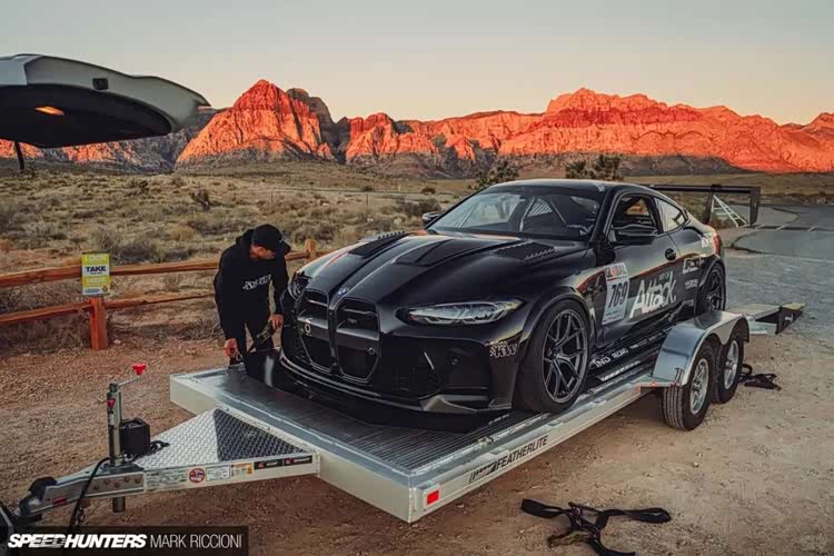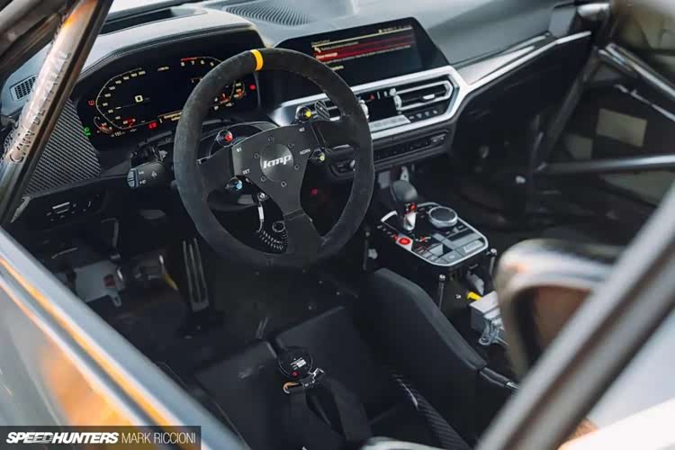 首先第一套是赛化的M4 Competition,能看到这台车其实做了很多赛道化的改装,尤其是它的前唇和那尺寸极其夸张的大尾翼,看着就知道不好惹。同时这台车也做了很极致的轻量化工作,能看到车内基本上把多余的东西都拆空了,加上防滚架,这由内而外的战斗感谁看了不迷糊啊?
