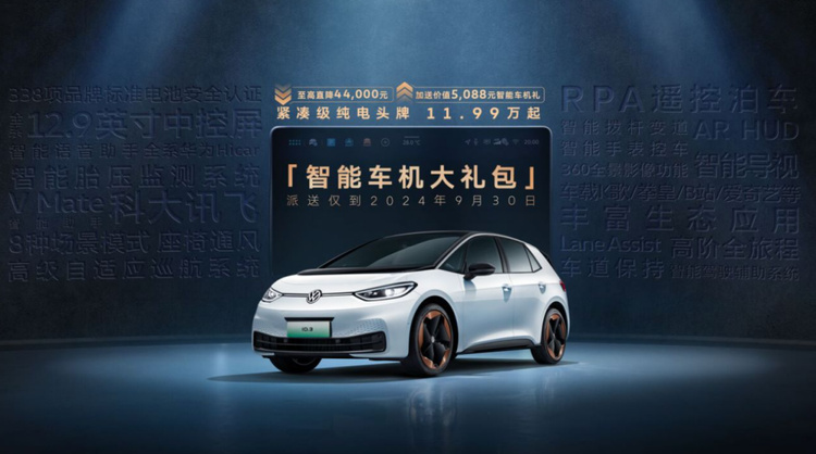 在七月的尾声,上汽大众ID.3 聪明款和ID.4 X聪明款同步焕新上市,智能加料,价格更惊喜。尤其是ID.3 聪明款,限时成交价仅需119,888元起,较原建议零售价至高直降6万元,消费者在9月30日前购车还能享受价值高达5,088元的智能车机大礼包,包含12.9”悬浮式中大控屏+ID.S 5.0系统。上汽大众这一波操作可以说是诚意十足,旨在把ID.3 聪明款打造成一个兼具品质和性价比的紧凑型纯电头牌!下面就来看看所谓“聪明款”到底“聪明”在哪里吧。