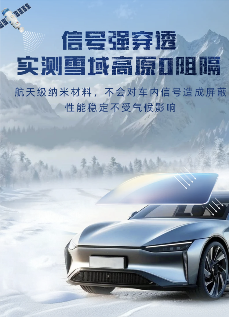 航天品质认证,采用航天级纳米材料,通过极端恶劣环境测试。稳定的性能即便是在雪域高原这种低温、高辐射地方也能维持材料特性,确保车内信号正常,为乘车安全再添一份保障。