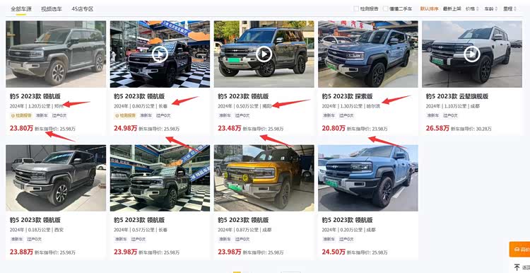 豹5的性价比一点都不怎么突出,就拿这辆2023款领航版来说,新车指导价是25.98万,而他们卖是23.8万,而这辆只跑了0.8万公里的,价格也要24.98万,更别提是探索版的,新车才23.98万,可他们却把价格卖到了20.8万,总之,这个价格就能看出来,二手车贩子们这下可谓是吃了大亏,收入腰斩也没啥,主要是亏本的问题。