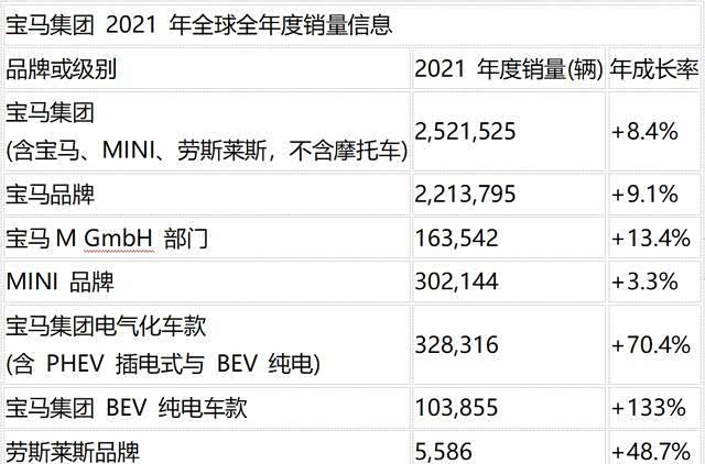目前宝马集团在四轮乘用车的品牌依旧有宝马、MINI、劳斯莱斯共 3 大支柱,各自在 2021 年全年的销量,分别为宝马品牌 221.3 万辆(+9.1%)、MINI 品牌 30.2 万辆(+3.3%)、劳斯莱斯品牌 5,586 辆(+48.7%),上述 3 个品牌即便 2021 年皆受到疫情与芯片荒等不确定因素笼罩,但依旧缴出向上成长的佳绩,也带动宝马全集团乘用车的 2021 年度销量来到 252.1 万辆、成长率达到 8.4%。