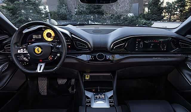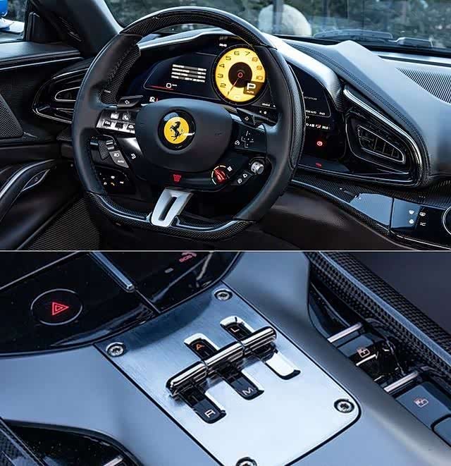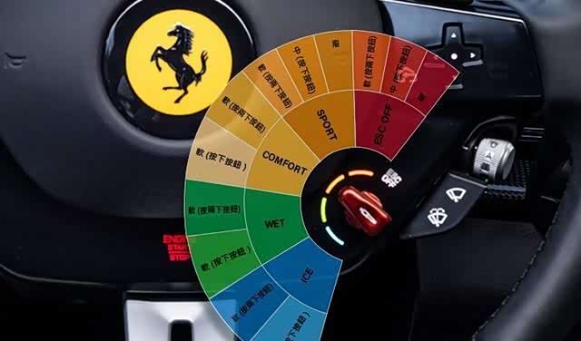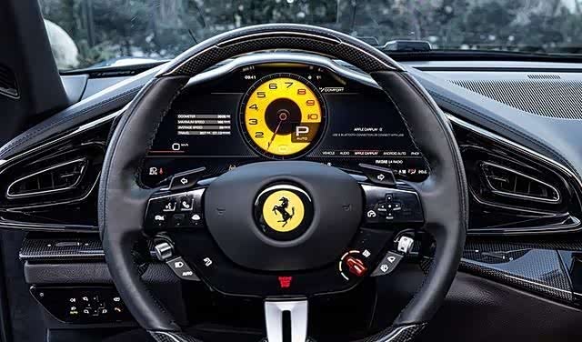 驾驶人与仪表板之间,则是已搭载在新世代 Ferrari 上的同一只三辐式方向盘,所以除了方向灯的控制按钮与喇叭外,中央盘辐皆换上了电容式的触控按键,不过、Purosangue 中央盘辐的按键位置与操作方式,与 Rona、SF90 车系和 296 车系都略有不同,但左侧同样可操作蓝牙通讯、灯号和 ACC 自动巡航系统,右侧则是荧幕显示的选择切换钮、雨刷与 Manettino (提供 ICE、WET、COMFORT、SPORT 及 ESC-OFF 共 5 种模式) 旋钮,且 Manettino 旋钮还多了悬挂软/硬设定的功能,正中央的下方则为引擎启动/关闭的按键,一样可让驾驶人的双手尽可能地维持在方向盘的 3 点与 9 点之位置。