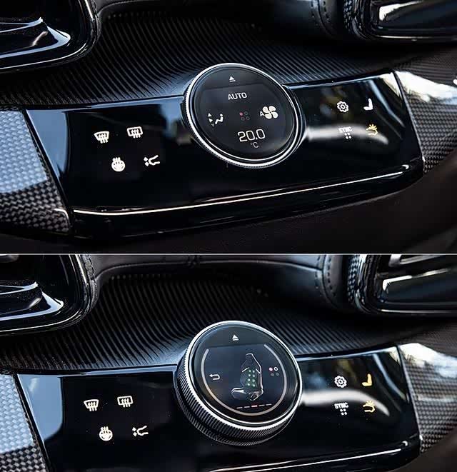 此外,为了方便驾驶与乘客个别调整空调等与舒适有关的设定,Ferrari 在中控台上半部的中央,嵌有一只隐藏式的旋钮,轻轻触碰上缘即会缓缓升起,让驾驶人与乘客可以在中央的圆形触控荧幕里搜寻选单,并借由旋钮的金属质感外环进行调整和操作 (后排乘客中央也设有功能相近的隐藏式旋钮)。