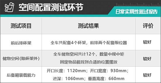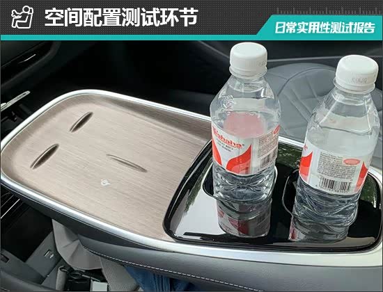 对于车内使用空间的测试,只针对前排触手可及的空间,不包括手套箱、中央扶手箱等需开启的空间。测试方法是将以下固定物品全部放置在前排的各个储物空间内,通过固定物品的放置情况来判断车辆储物空间的表现。测试选定的固定物品为:2瓶常规大小的矿泉水、1部大屏手机、1支口红、1个挎包、1副墨镜、1把折叠雨伞以及1包常规尺寸的抽纸。
