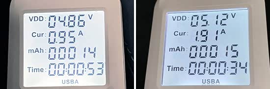 此外,我们对USB接口的电压与电流进行了测试。其中,前排USB Type-A接口的电压和电流分别为4.86V和0.95A左右。后排USB Type-A接口的电压和电流分别为5.12V和1.91A左右。