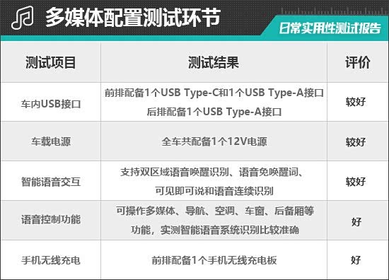 评测车配备1个USB Type-C接口和2个USB Type-A接口。其中,前排1个USB Type-C接口和1个USB Type-A接口,位于前排储物格内;后排1个USB Type-A接口,位于空调出风口下方,布局合理且兼容性不错。此外,前排中控台下方储物格处还提供1个12V电源接口。