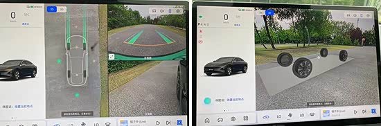 评测车配备了360度全景影像,并提供透明底盘功能,方便驾驶员查看车辆底部道路情况。影像清晰度不错,车辆周围的畸变控制也比较合理,还配备了泊车辅助线,实用性不错。