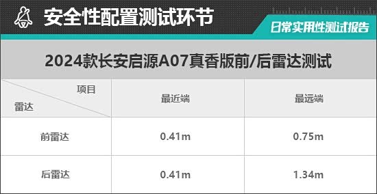在雷达测试过程中,评测车的后雷达最远可在1.34m处感应到后方物体,后雷达功率表现不错。参考往期测试经验,持续蜂鸣阶段越接近0.25m则越贴近日常使用习惯,从实测数据来看,后雷达持续蜂鸣阶段最近距离为0.41m,与测试经验值差距较大。