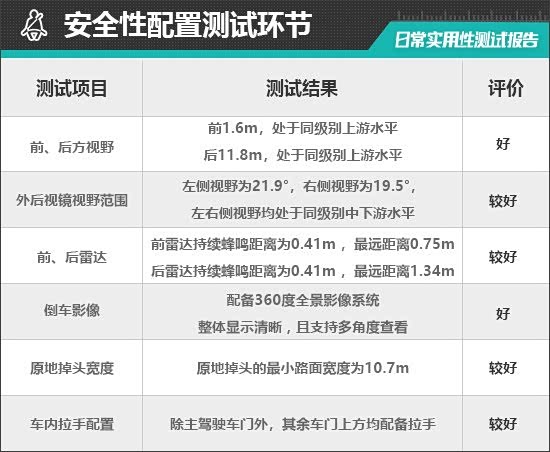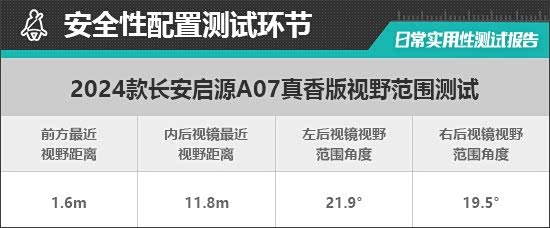 在车辆前、后方视野测试中,车内所有座椅均已调整至最低状态,所测出的数据与驾驶者正常使用时均有一些偏差,仅供参考。