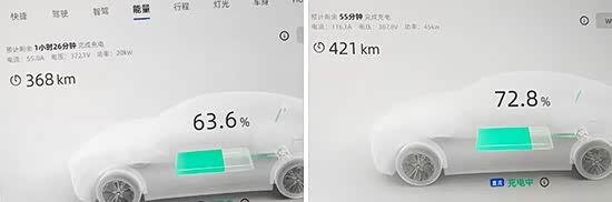 此外,对于充电效率我们也进行了测试。实测人员使用快充桩充电10分钟后(波峰用电),电量从63.6%充至72.8%,续航里程增加53km,与车辆电脑预计的用时基本吻合。