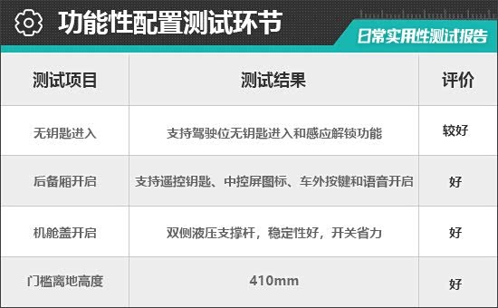 对于消费者来说,门槛离地高度一定程度上决定了上下车便利性。根据实测结果来看,评测车门槛离地高度为410mm,驾乘人员日常上下车比较方便。