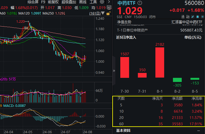 截至8月5日,中药ETF(560080)近20日资金净流入超2.1亿元,近60日更是获资金增仓超3.5亿元!最新基金规模达20.46亿元,位列同类ETF第一!
