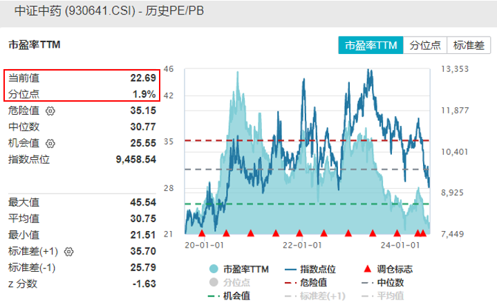 资金布局背后,是中药板块估值“性价比”的持续凸显。截至2024年8月5日,中药ETF(560080)标的指数(中证中药指数)最新市盈率(PE-TTM)为22.69倍,近10年估值分位点1.9%,意味着其市盈率低于近10年以来98.1%的时间区间,估值逼近10年历史极值!