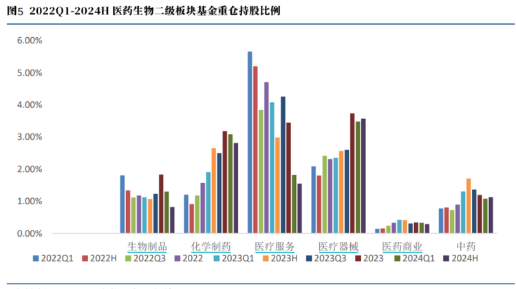 从医药行业基金重仓股的二级板块轮动的角度上看,同样是中药板块和医疗器械占比提升。