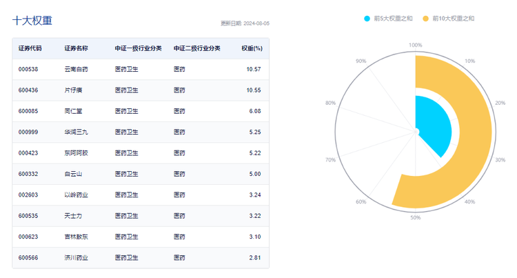 从中证中药指数权重股来看,重仓股为行业龙头且集中度较高。指数第一大重仓股为云南白药,占比10.57%,第二大重仓股片仔癀占比10.55%。此外,前十大重仓股还包括同仁堂、华润三九、东阿阿胶、白云山、以岭药业、天士力、吉林敖东、济川药业等国内老字号中药龙头。指数前五大重仓股占比达37.67%,前十大重仓股占比达55.05%。