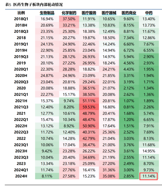 随着公募基金二季报密集发布,全市场基金的前十大重仓股数据揭晓。据中航证券统计,2024上半年医药基金重仓股全市场排名第三,细分到二级子板块,仅中药板块和医疗器械板块在基金重仓股的占比提升。值得注意的是,自2023年三季度以来,中药板块在连续3个季度占比下降后,二季度首次出现提升!(来源:中航证券《2024H行业基金重仓持股数据出炉,器械、中药板块内部轮动占比提升》)