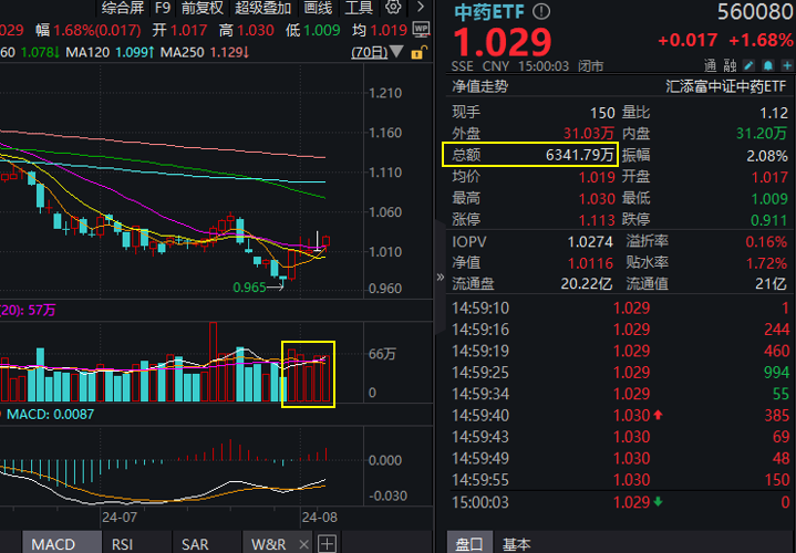热门ETF方面,中药ETF(560080)8月6日高开高走收涨1.68%,再度站上20日线,全天成交额超6300万元,位居同类第一,近5日成交额均在4800万元以上! 值得注意的是,中药ETF(560080)收盘溢价率高达0.16%,场内几乎全天维持溢价交易,资金布局热情凸显。