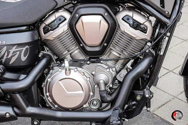 说到动力系统,国产车型在主力开发V型双缸发动机,相较于直列双缸发动机而言,在振动控制、低扭矩表现、个性化、外形设计和声浪以及重心控制和操控性等方面具有一定的优势。金吉拉450搭载一台V型双缸水冷四气门发动机,实际排量为448cc,最大马力50.3匹,最大功率37kW/8500rpm,最大扭矩45Nm/7000rpm,匹配滑动离合以及皮带传动,最高时速可达150km/h。
