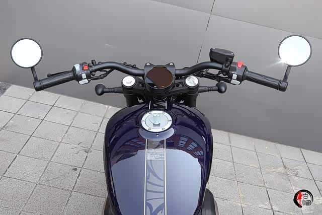 手把镜、宽平把基本已经成了复古巡航的标配,一方面骑行姿态比较舒适,其次手把镜确实让颜值看起来更具动感。手把中央的仪表采用圆形LCD液晶显示,对于仪表而言没有什么太多可介绍的,金吉拉300、以及最新发布的灰石250都在用,提供了模式转速、时速、时间、里程、剩余油量等基本信息。