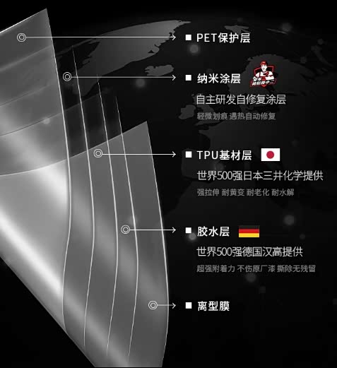 就目前而言,好的隐形车衣都是TPU材质的。膜小二选用进口脂肪族TPU,这是一种比芳香族TPU更稳定、更耐黄变的材质,抗剐蹭、耐腐蚀、耐黄变性能绝佳,防护效果非常好。膜小二使用的胶水也是德国汉高胶水,不仅保证隐形车衣的附着力,使其贴的更为牢固,而且换膜撕下时不会留下痕迹。这些TPU基材和胶水都是和进口大牌同级别的原料,因此膜小二车衣在品质上也不输进口车衣。
