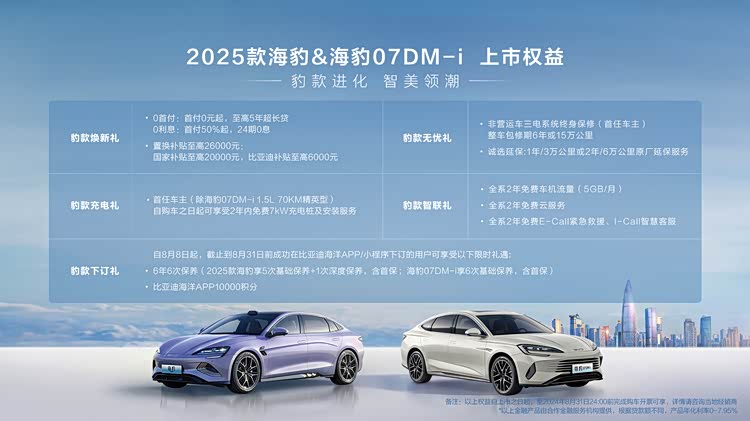 - 海豹07DM-i:售价区间为13.98万元至19.58万元,提供五款配置车型。同样享受24期0息贷款、至高26000元置换补贴,以及全系2年免费车机流量(5GB/月)等优惠。
