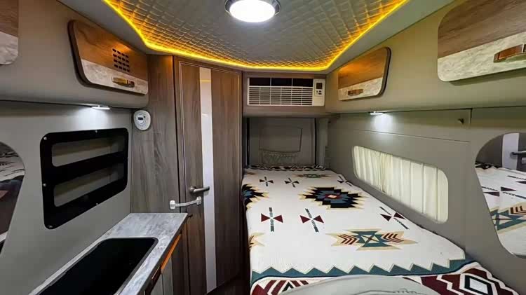 这款车还有一个亮点,那就是尺寸比较适中,长宽高分别为5500*2030*2600毫米,其中之所以车长达到了5500,原因是车尾部带有齐星独家的外置炉灶(车尾备胎罩内)以及车尾空调室外机;至于车身高度,是因为这款车采用了高顶底盘,虽然限制了进出地库的资本,但是2.6米的也为内部提供了不错的垂直空间,即便是在不打开车顶的状态下,内部依然可以站立。