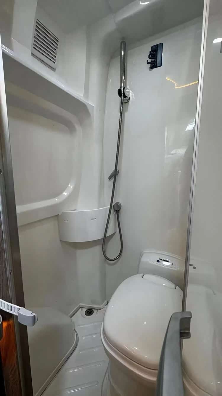 同样,得益于整车高度,车尾部设置了一个标准的独立卫生间,内部空间比较宽敞,提供了盒式马桶、淋浴花洒、换气扇等设备,比起低顶车型的卫生间,这款车里的卫生间使用更舒服。搭配车内的140升清水箱和50升灰水箱以及柴油暖风暖水系统,可以满足日常洗漱。
