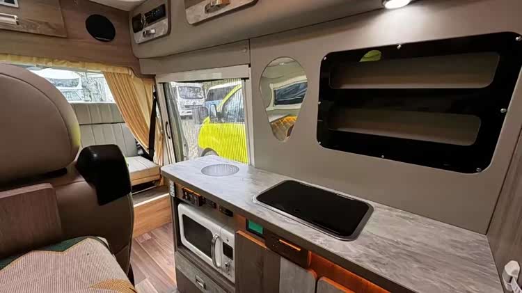 车厢在右侧是车内的厨房区域,整体操作台尺寸挺宽敞,提供了电磁炉、洗菜池、微波炉、冰箱等设备。