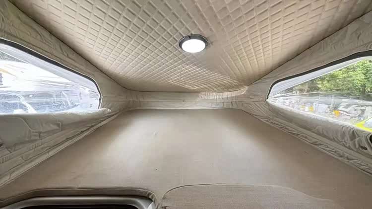 第二张床则是车顶弹开以后,内部的一张双人床,尺寸非常宽大,可以轻松睡下两个成年人,如果是现在这个盛夏时节,开着这辆车去内蒙草原或者太行山深处,夜晚在车顶床里睡觉,还是比较舒服的。